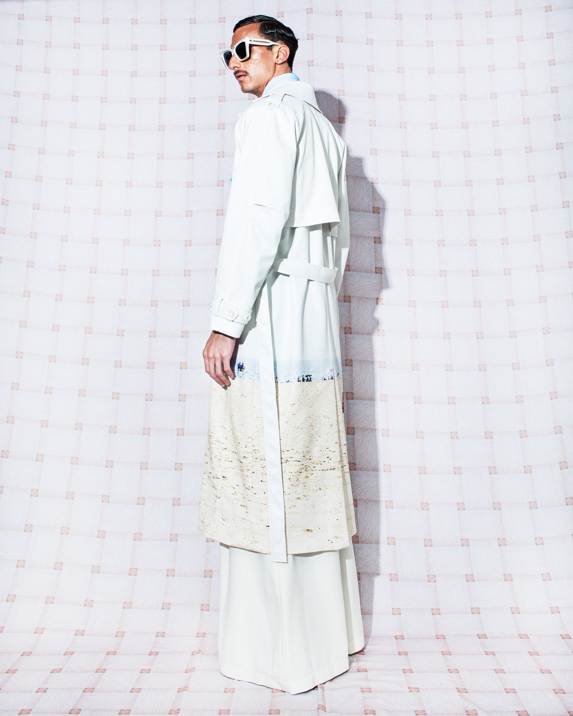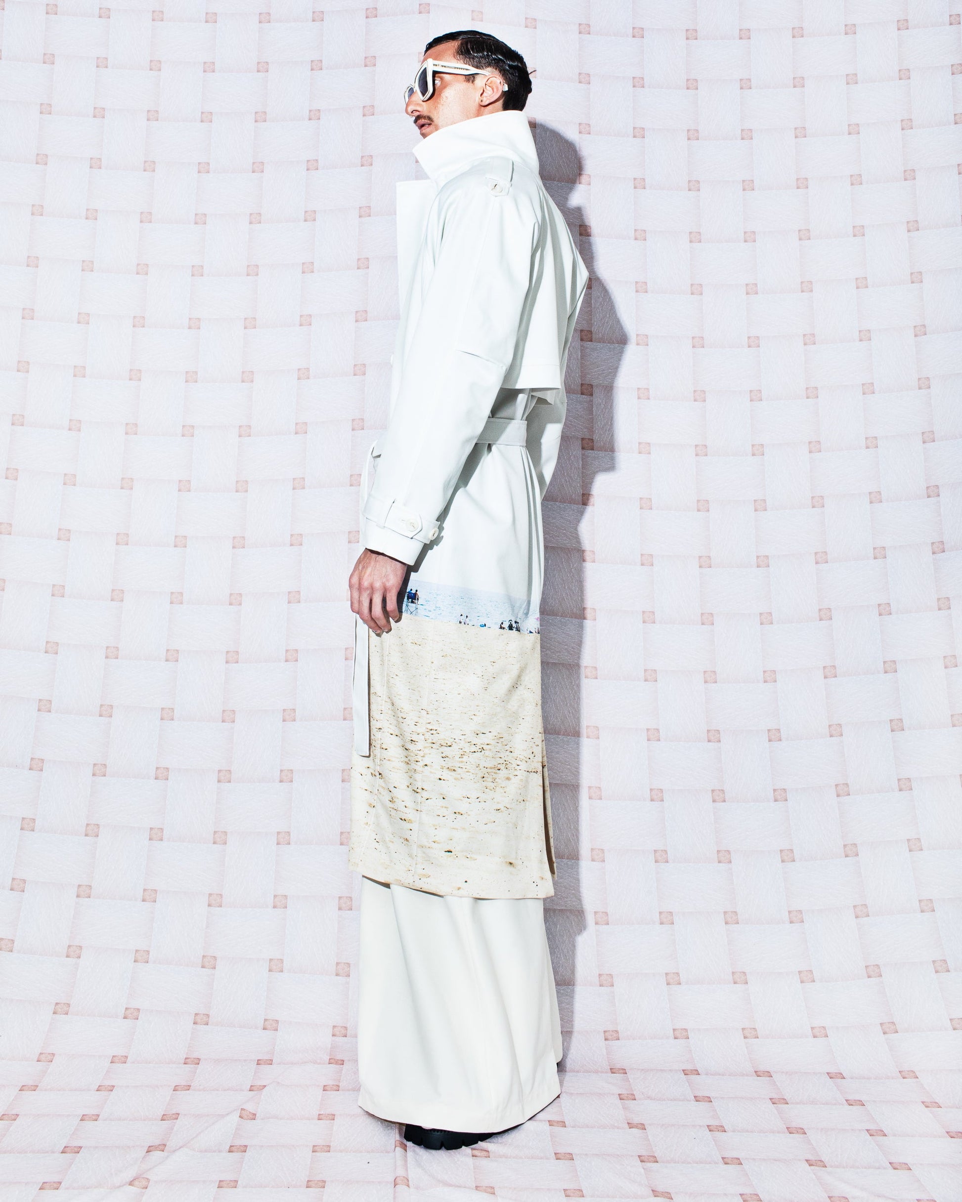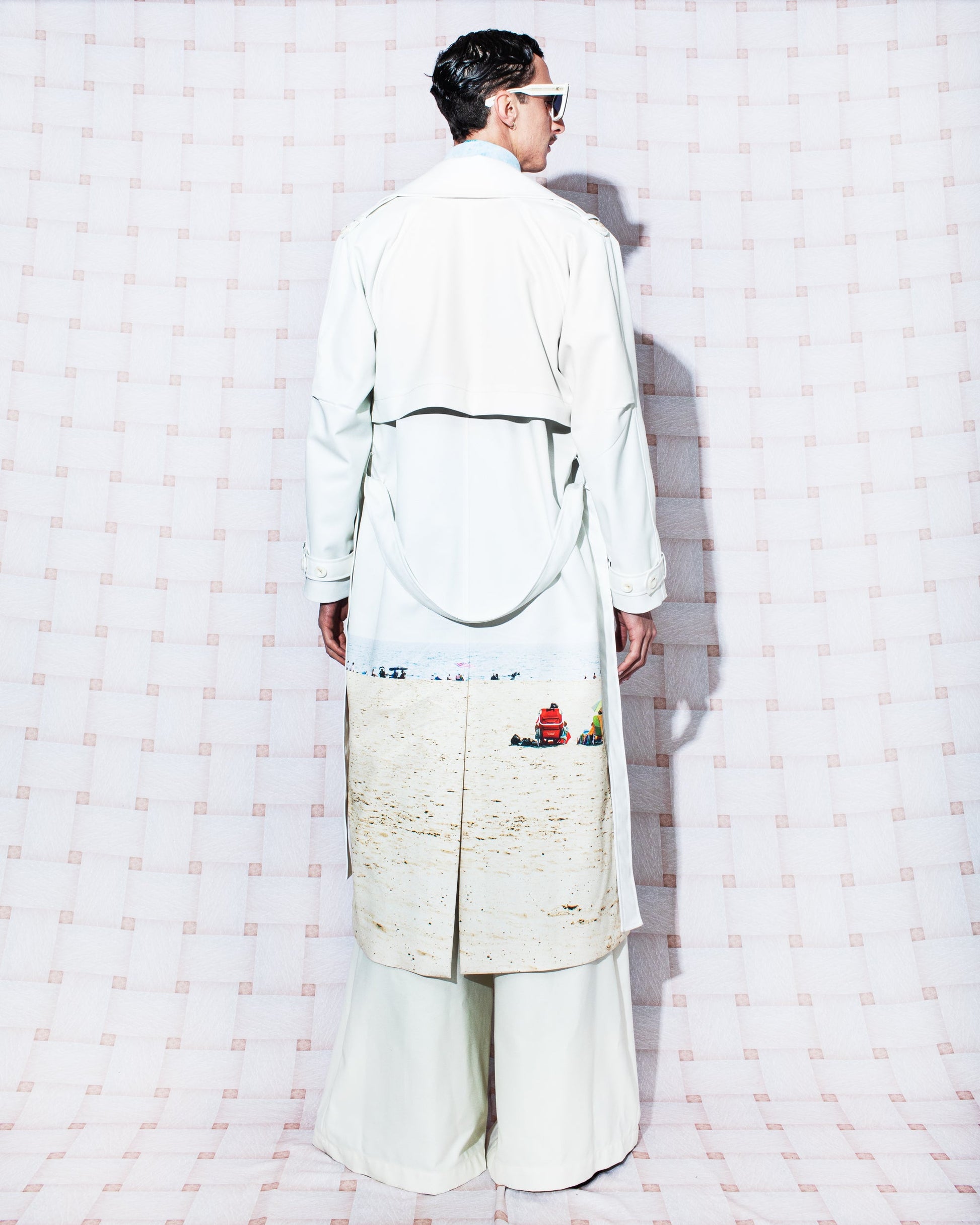 Our coat is an essential garment, inspired by classic menswear styles. It features timeless lines and squared proportions, crafted from 100% recycled polyester, with pronounced shoulders and a soft lining that enhances the silhouette. The piece is printed with photographs in sand and skin tones, applied via digital sublimation using water-based inks. Made in Colombia from polyester, this design incorporates images from our archive, taken on September 19, 2022 at 10:29 AM in Coney Island, New York, USA (40°57′72.86″ N 73°97′19.10″ E).