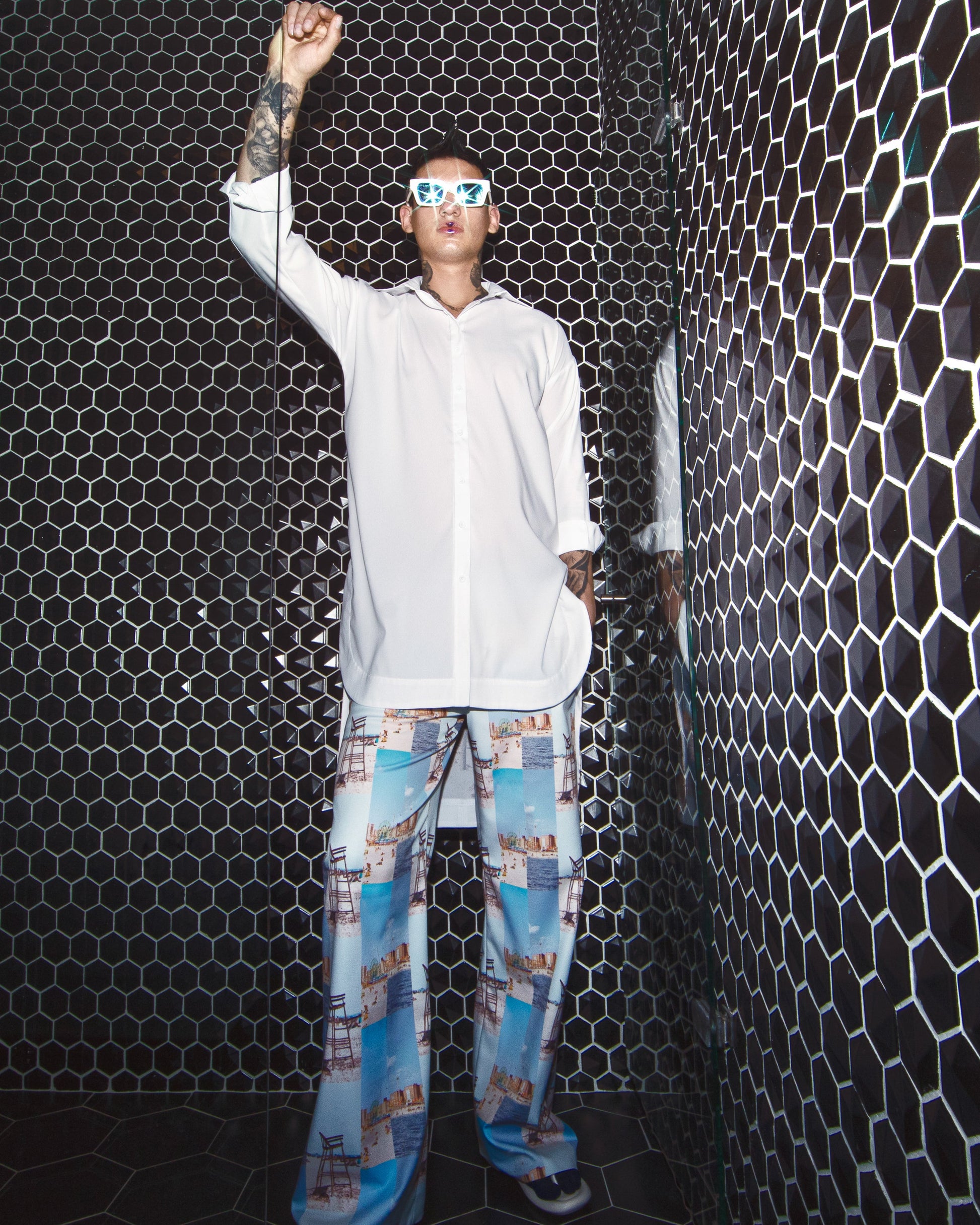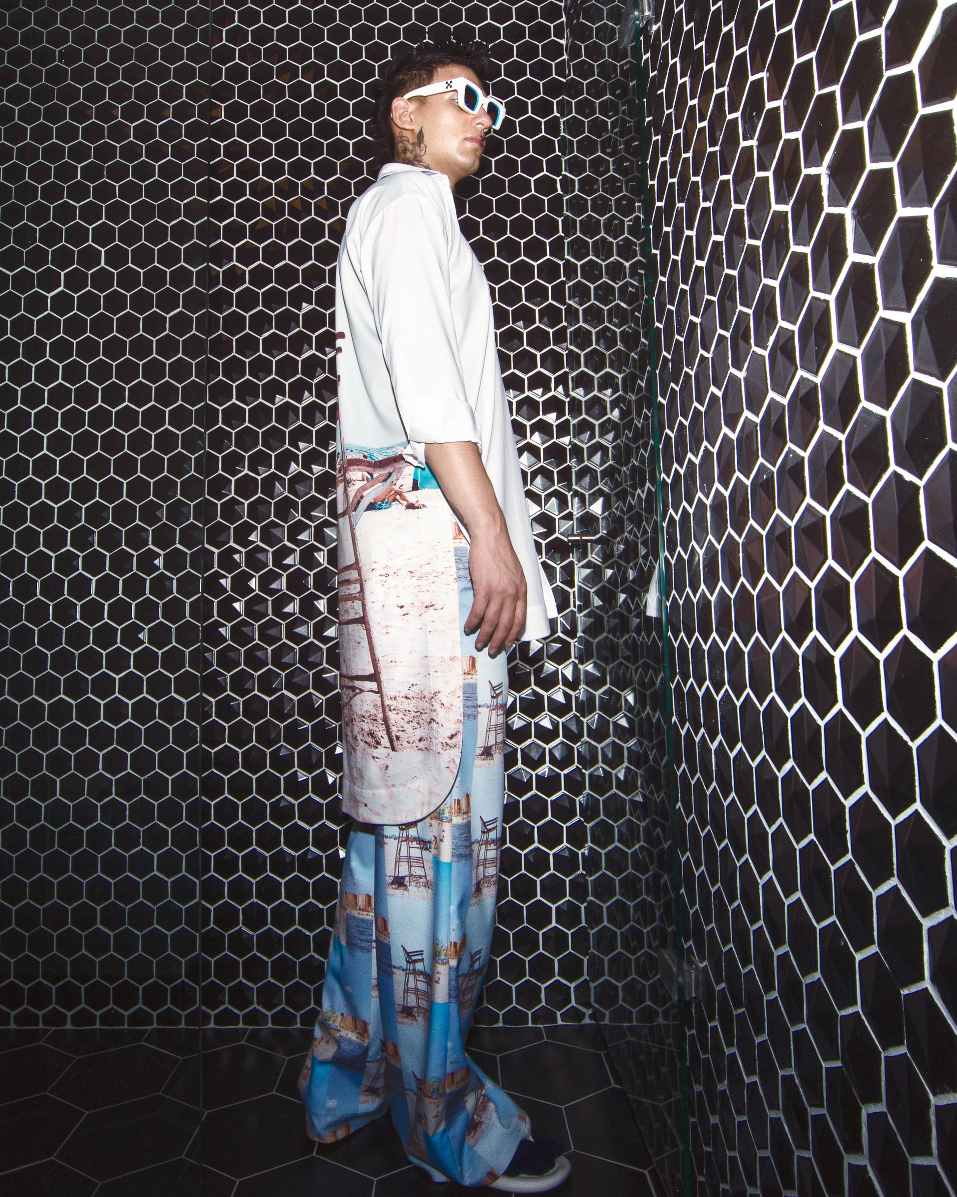This long-sleeved shirt features front buttons, a wide silhouette, and an asymmetric cut, creating a unique and contemporary look. The design was inspired by a photograph taken in Coney Island, USA. Made from 100% polyester, this shirt is expertly crafted in Colombia.