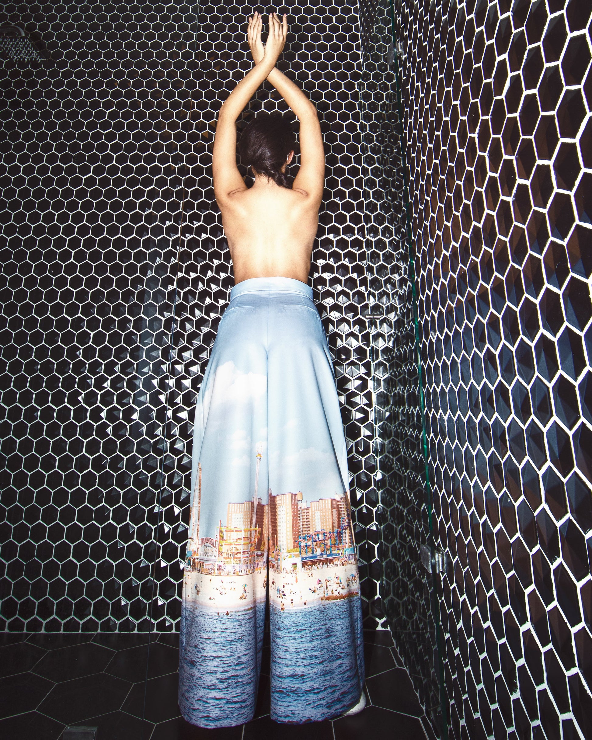 These palazzo pants feature a wide-leg design that flows from the hips down to the ankles, offering both comfort and style. Tailored with classic precision, they include side pockets for added functionality. The pattern is inspired by a photograph taken in Coney Island, USA. Made from 100% polyester, these pants are crafted in Colombia.