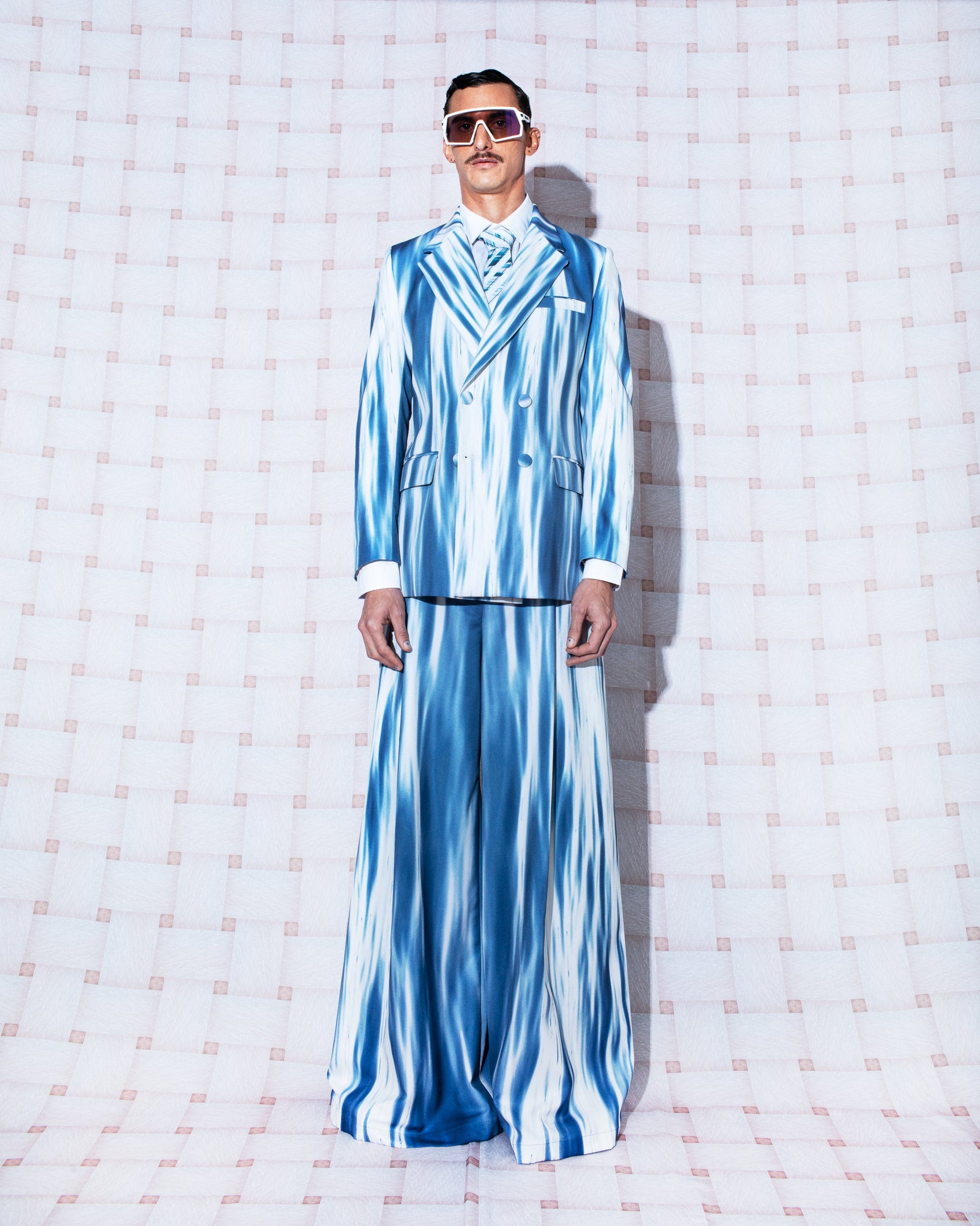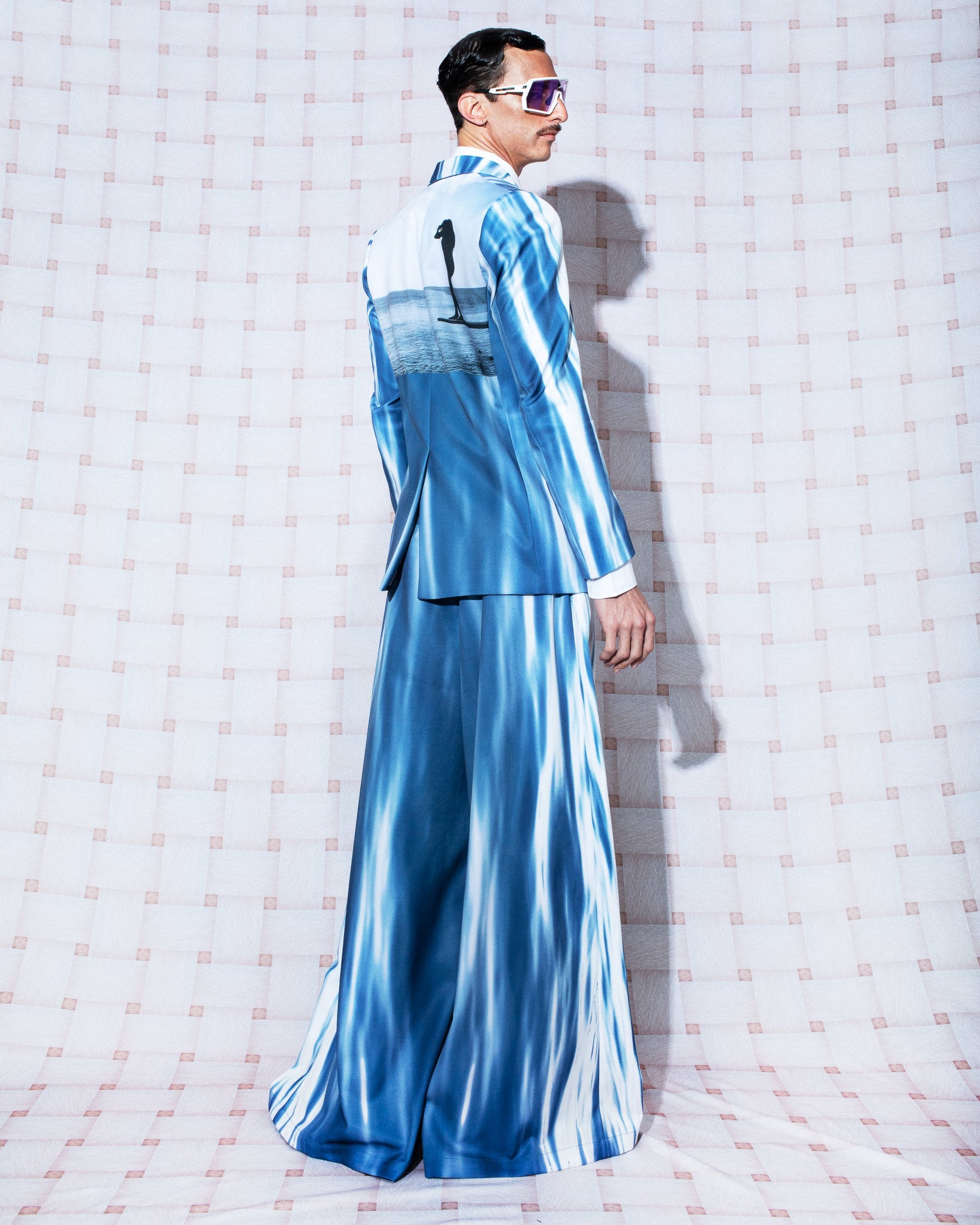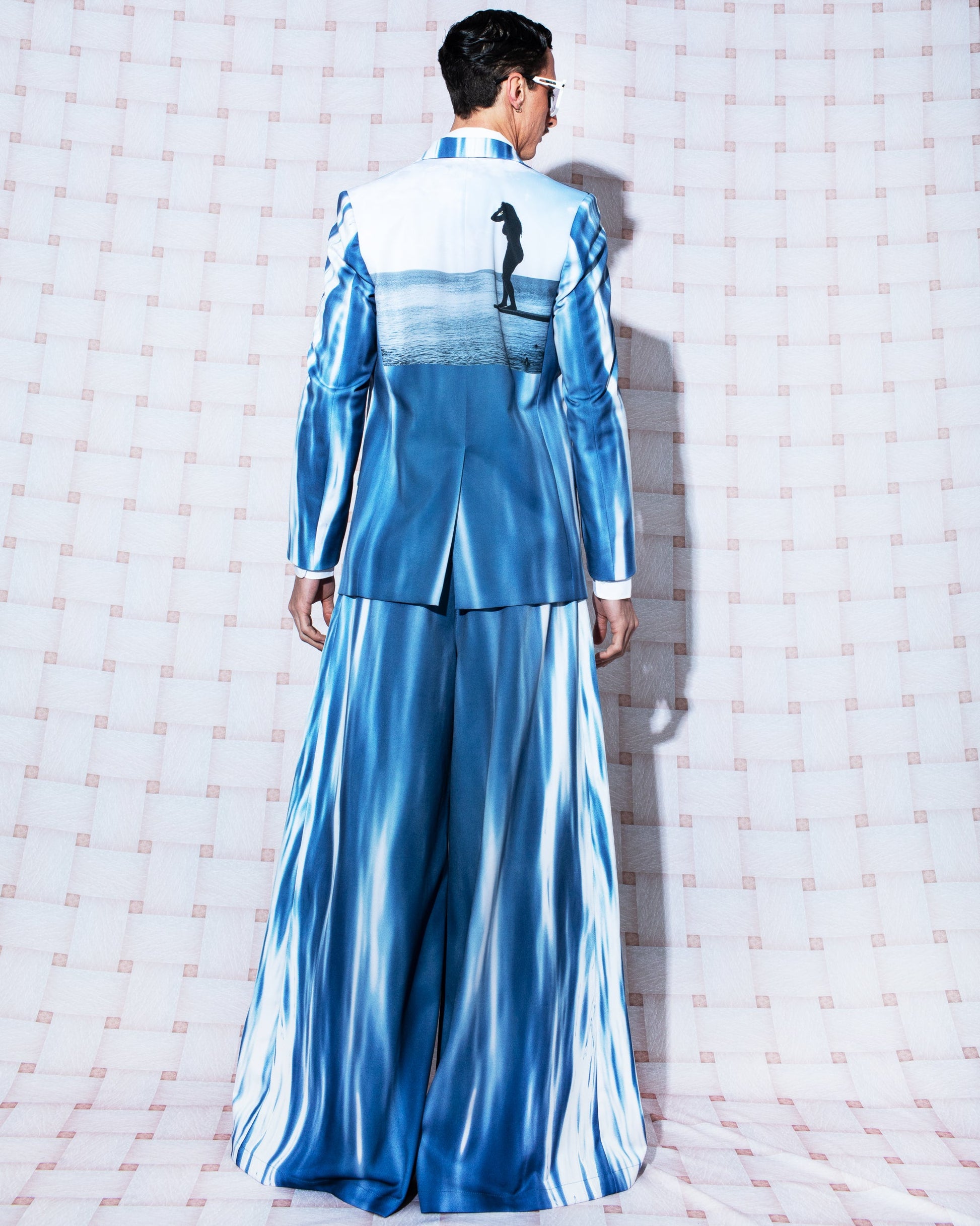 Statement oversized blazer featuring classic tailoring and structured, padded shoulders. Crafted in Colombia from recycled polyester, it showcases two archival photographs in rich blue hues, digitally sublimated with water-based inks. The images were taken on Contadora Island, Panamá (August 1, 2009 at 7:39 AM — 8°37′52.7″ N 79°02′38.8″ W) and San Andrés Island, Colombia (January 15, 2014 at 11:33 AM — 12°28′55″ N 81°43′51″ W), making each piece a wearable narrative.