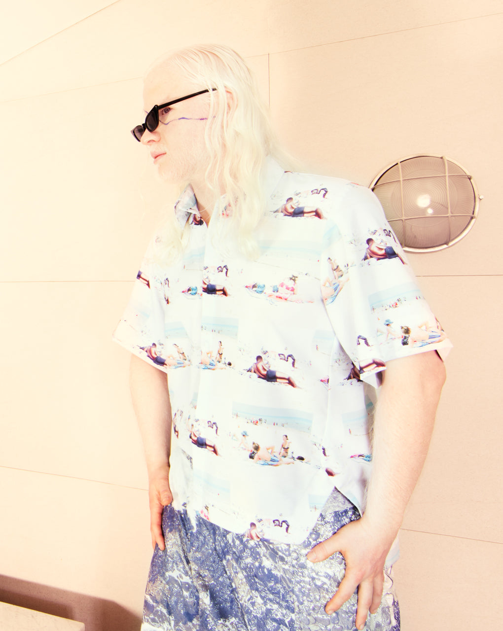 This modern guayabera features button fastening, short sleeves, and a wide, relaxed silhouette with an asymmetric cut that adds a contemporary touch to its timeless design. The pattern is inspired by photographs captured in Miami and Barcelona, blending tropical warmth with Mediterranean charm. Made from 100% polyester, it offers lightweight comfort and effortless style, perfect for sunny days and laid-back occasions.