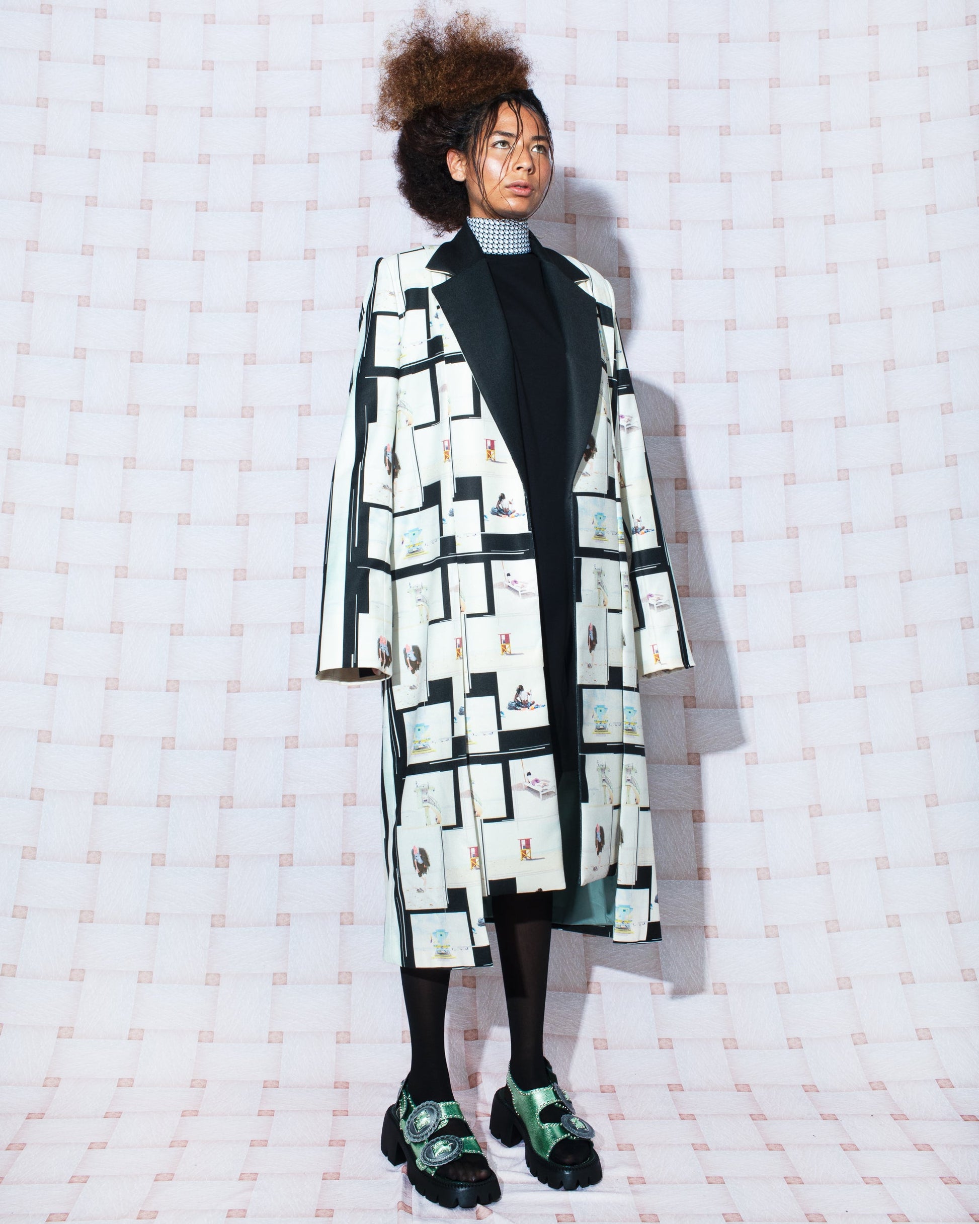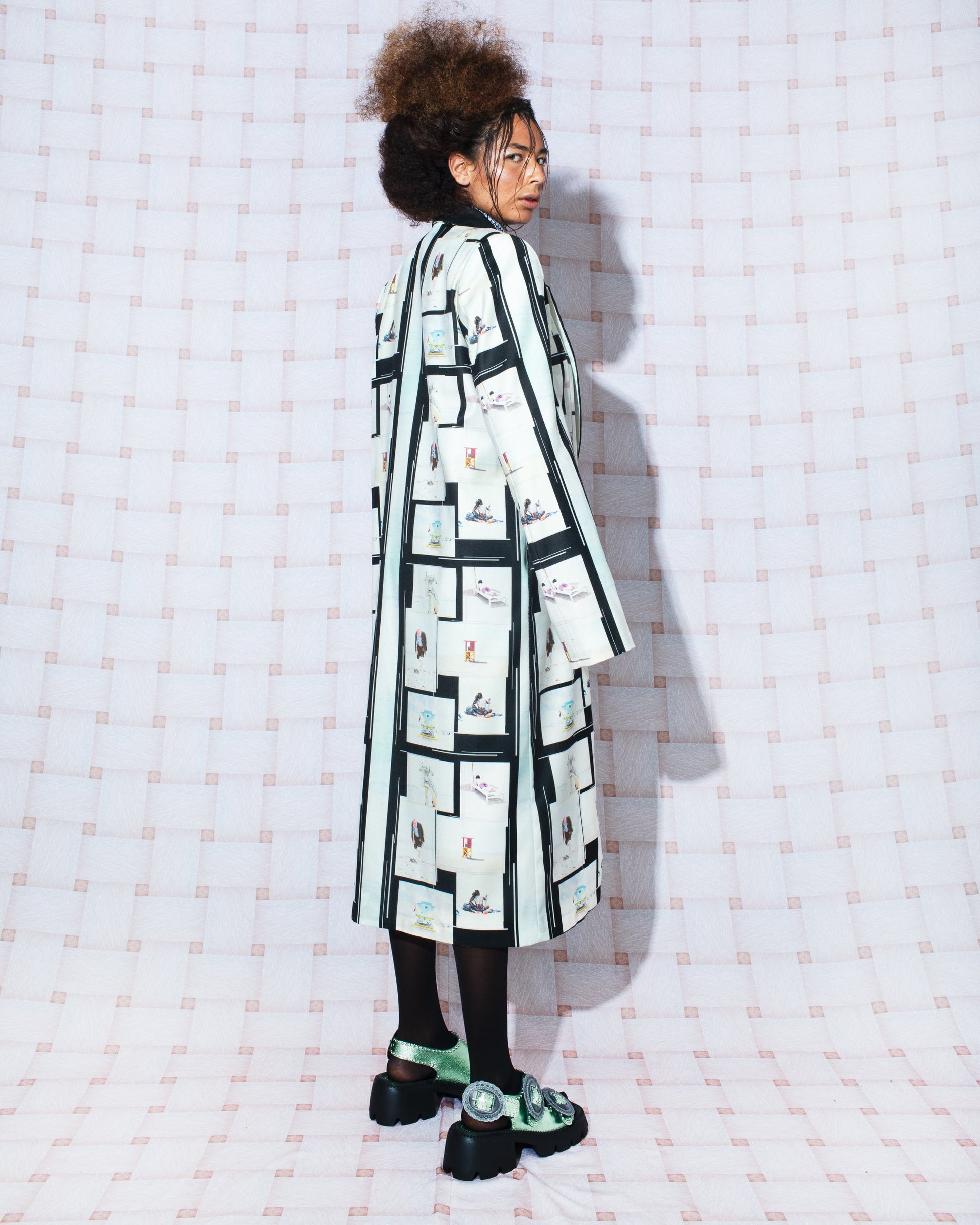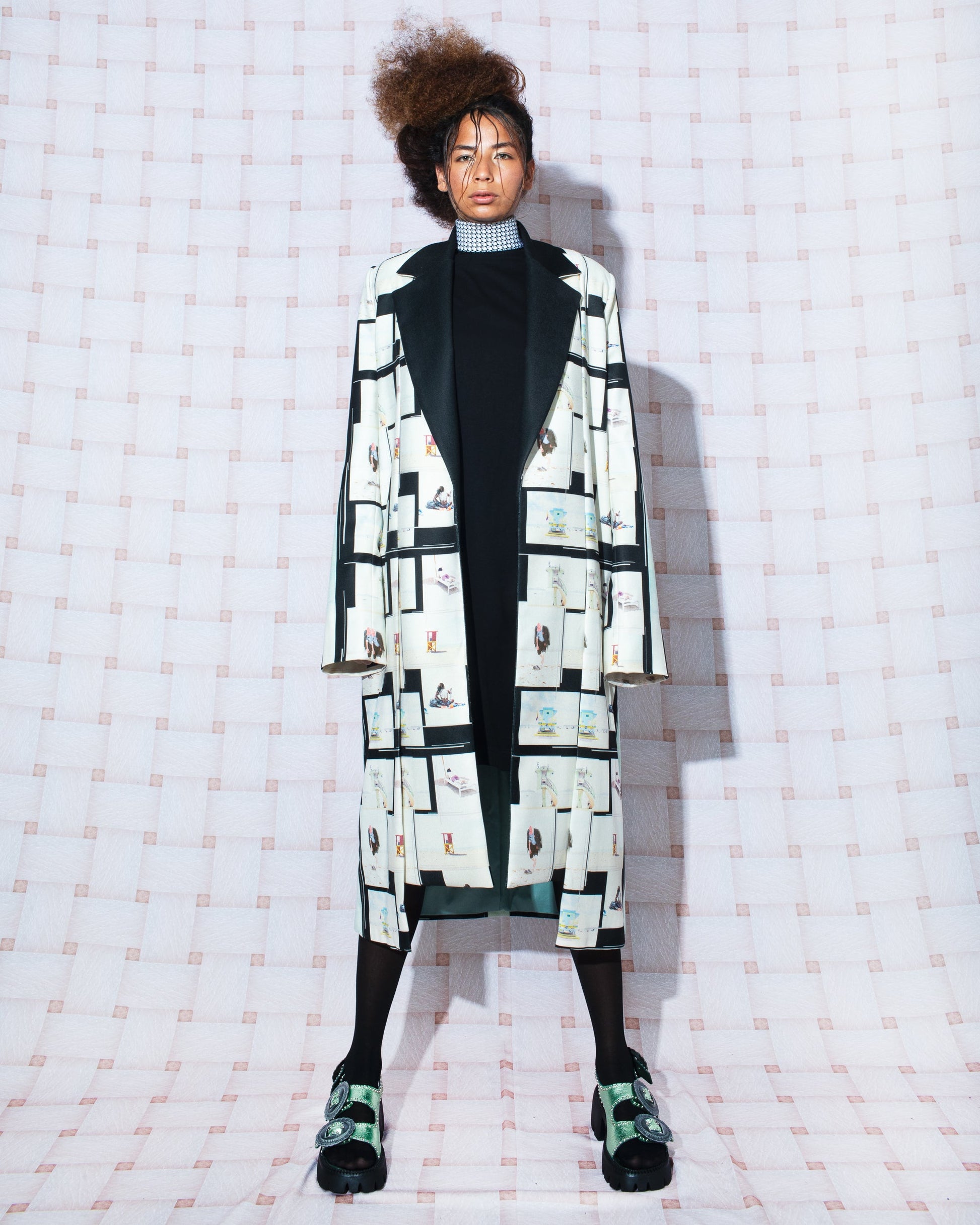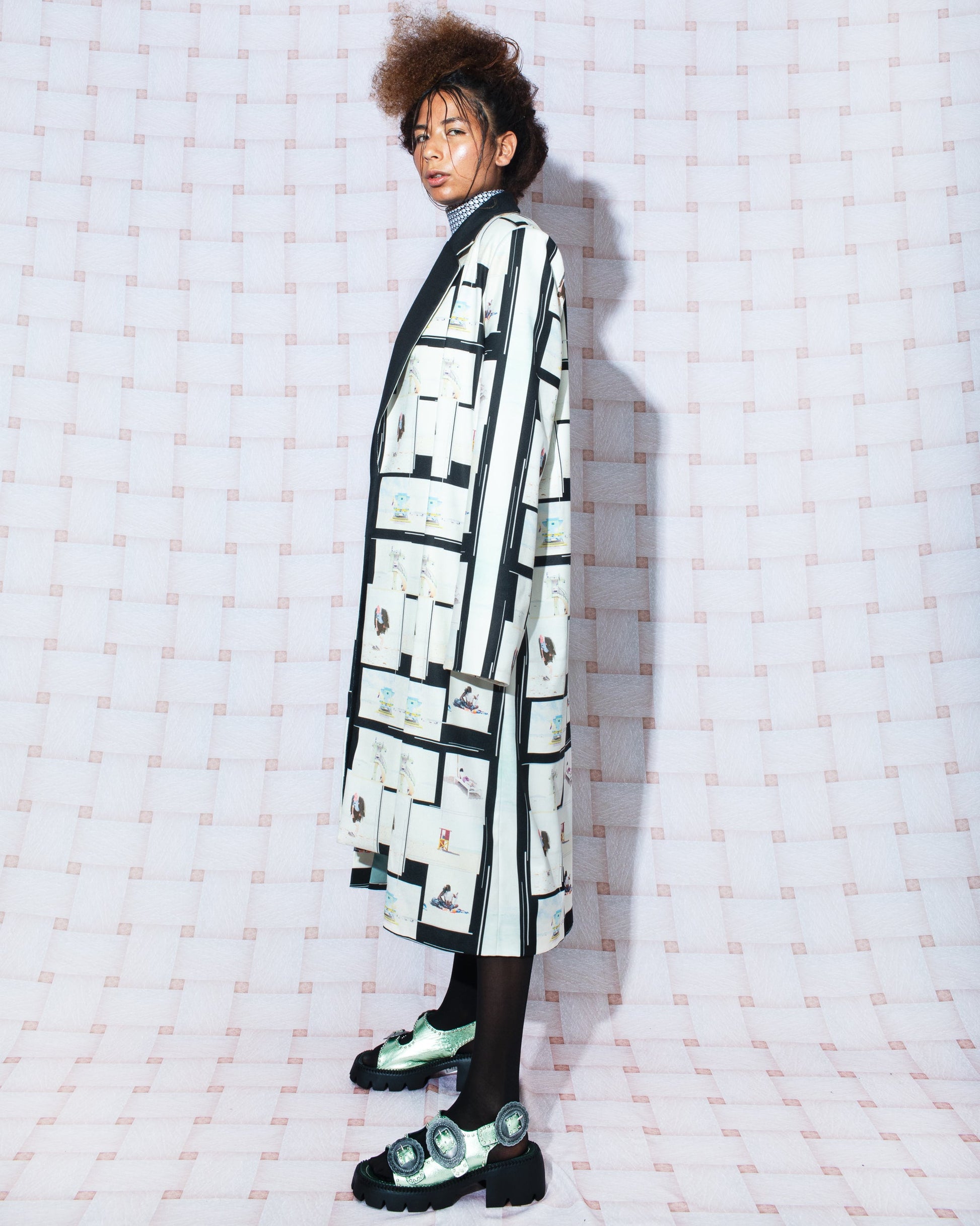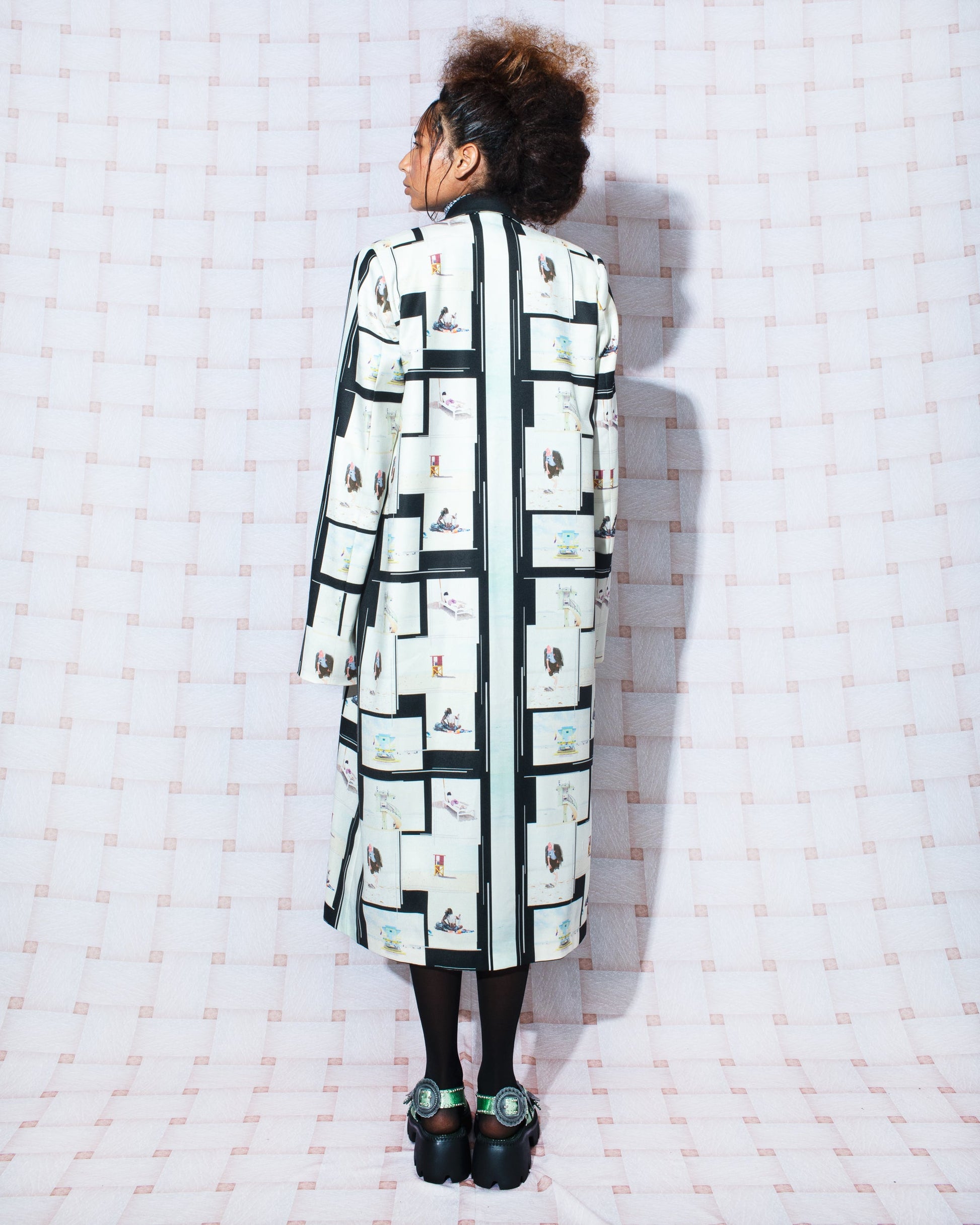 Our eco trench coat is an essential piece. Inspired by classic menswear styles, its timeless lines and more squared proportions are crafted from recycled polyester, featuring structured shoulders and a soft lining that enhances the silhouette. The print presents a black base with color photographs in sand tones. Made in Colombia, digitally sublimated with water-based inks.