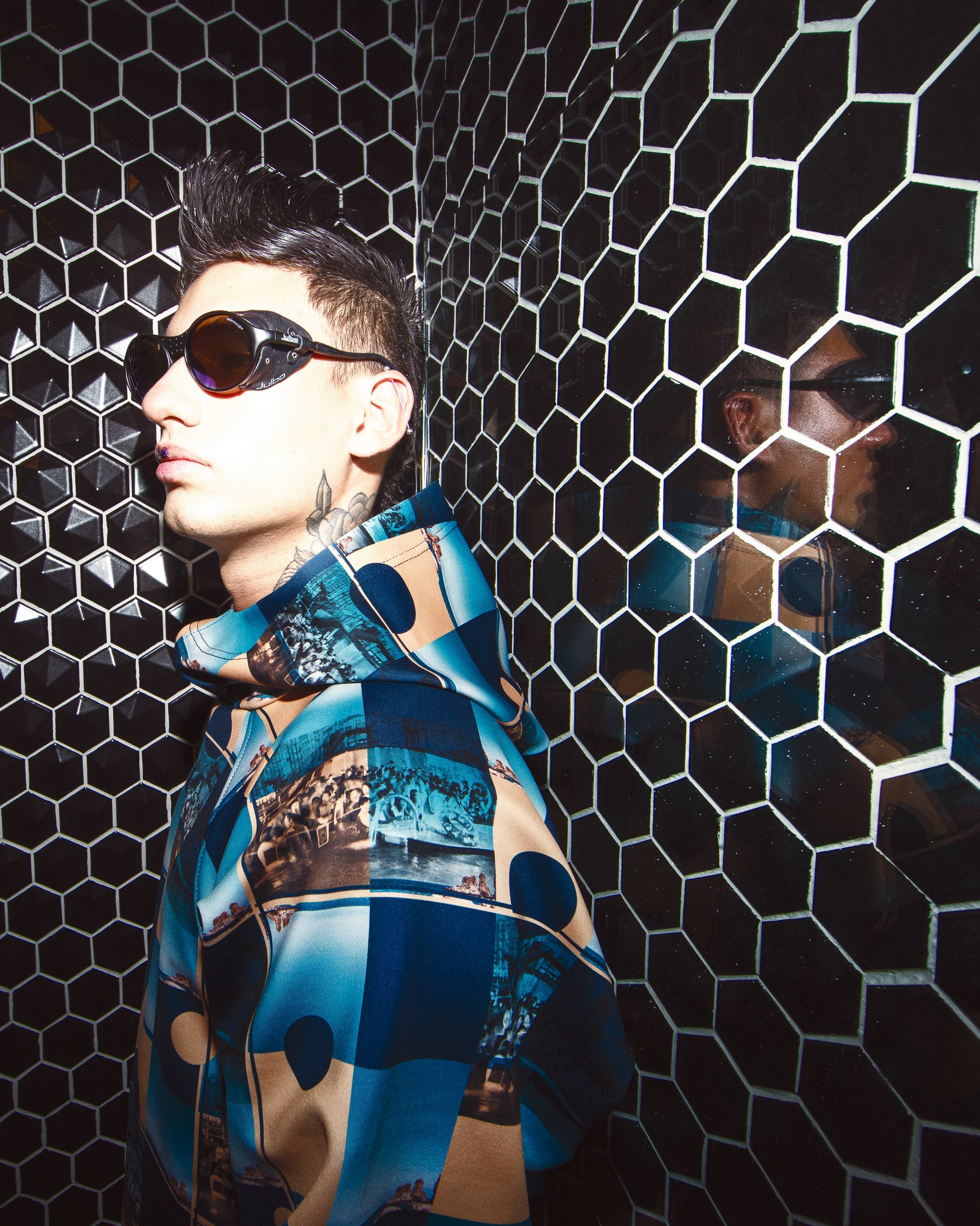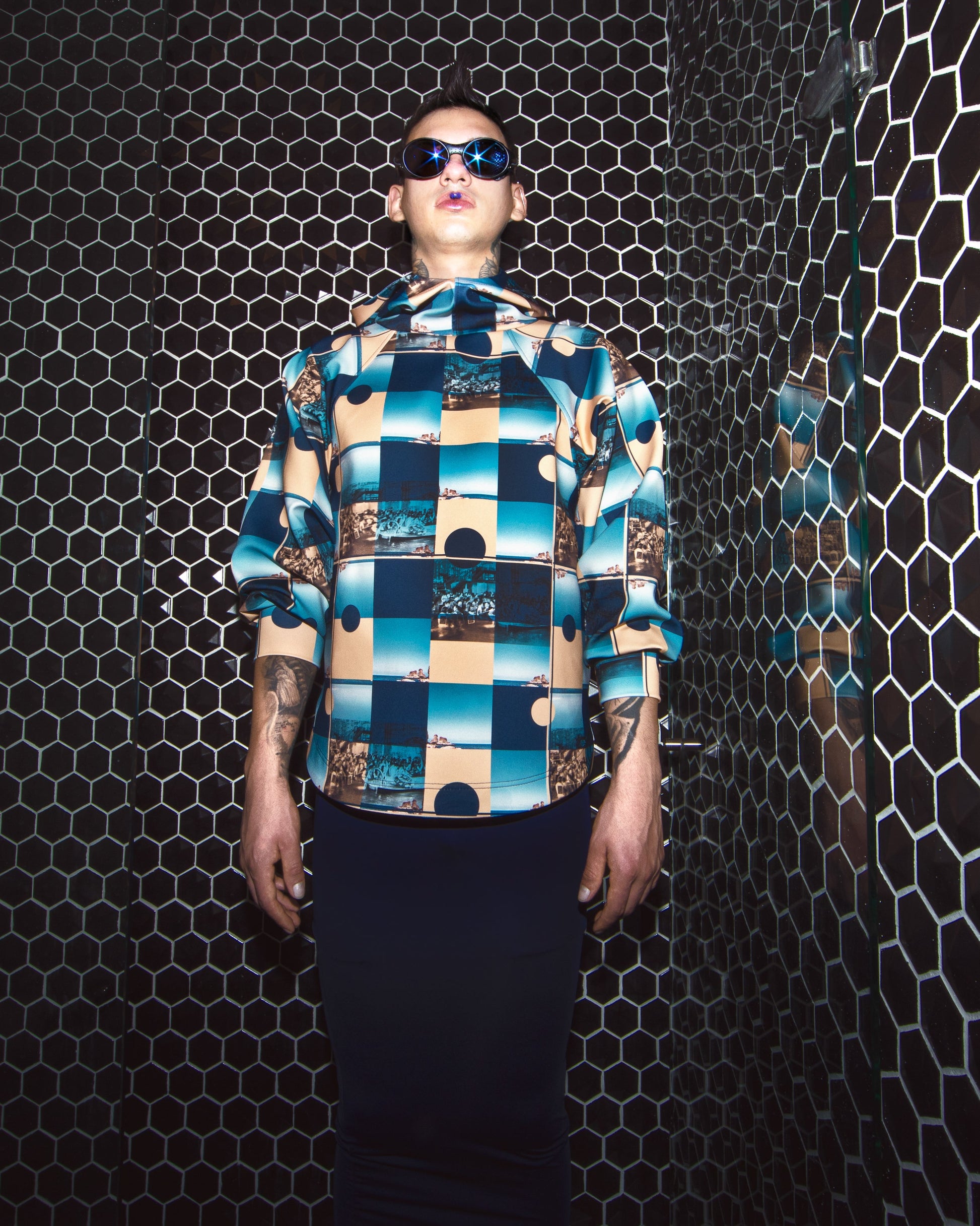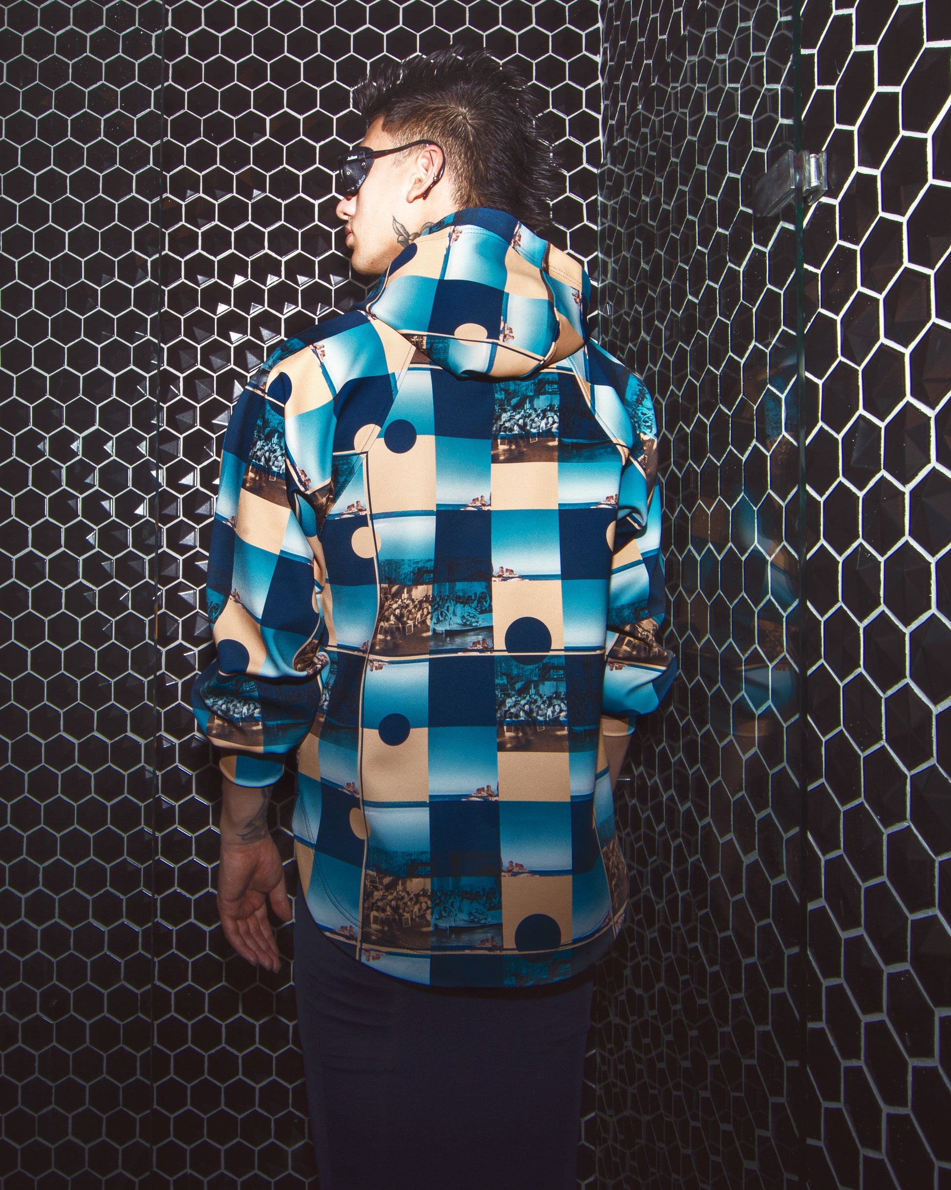 This long-sleeved hoodie boasts a wide silhouette, asymmetric cut, and wide sleeves for a bold and comfortable look. The pattern is inspired by photographs taken in Osaka, Japan, and Sicily, Italy, bringing together a blend of urban and coastal influences. Made from 88% polyester and 12% elastane, it offers a perfect balance of stretch and durability. Crafted in Colombia, this hoodie is designed to make a statement while ensuring comfort and style.